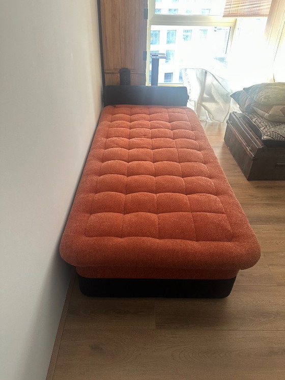 CondizioneMolto buonoColoriArancione, NeroMaterialeLegno, TessileNumero di articoli1Altezza35 cmLarghezza90 cmProfondità200 cmAltezza del sedile38 cm