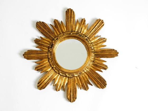 Bellissimo specchio da parete a raggiera di metà secolo in legno e resina, placcato oro.