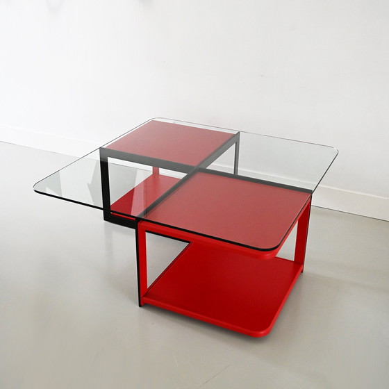 Bellissimo tavolino con struttura in acciaio e piano in vetro. Include due tavolini laterali mobili. In ottime condizioni. Dimensioni: 100 x 100 x 40 cm.