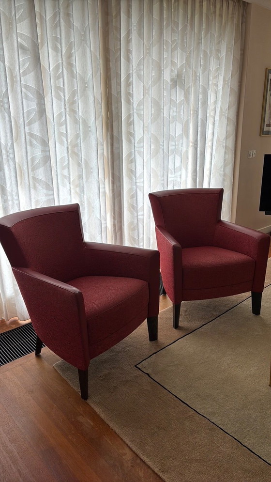 Questa coppia di poltrone artigianali Bielfelder Wertstatten presenta un design moderno con un ricco rivestimento in tessuto rosso e robuste gambe in legno. Le poltrone sono realizzate con attenzione ai dettagli e offrono comfort e stile. Perfette per aggiungere un tocco di eleganza a qualsiasi spazio abitativo.