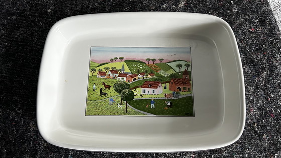 Piatto in porcellana vitrea di Boch & Villeroy, decorato con un dipinto naif di Laplau raffigurante una scena di villaggio.