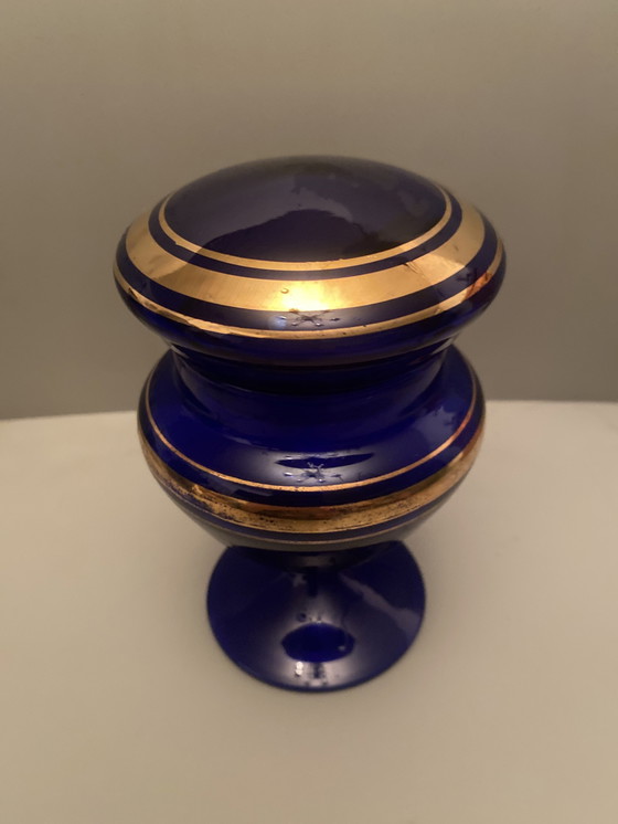 Questa squisita bomboniera in vetro di Murano degli anni '50 è una testimonianza dell'eleganza senza tempo dell'artigianato italiano. Il vetro blu cobalto brilla di riflessi brillanti e violacei, creando un effetto visivo accattivante che viene ulteriormente esaltato dalle lussuose finiture in oro 24 carati.