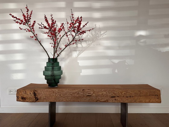 Questa panca unica è ricavata da un tronco di catalpa, che le conferisce un fascino rustico e naturale. Con una larghezza di 135 cm, una profondità di 35-40 cm e un'altezza di 43 cm, è dotata di una robusta base in acciaio che ne garantisce la stabilità. Le venature e la consistenza naturali del legno sono splendidamente conservate, rendendola un pezzo unico per qualsiasi casa.