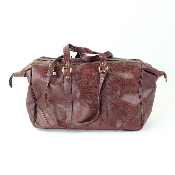 Borsa da viaggio vintage in pelle marrone con finiture in ottone, Cecoslovacchia, anni '60