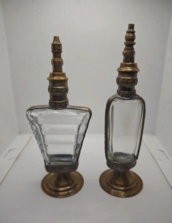 Magnifica coppia di boccette di profumo antiche (o boccette di aspergillo), perfette per un arredamento di carattere o per un gabinetto delle curiosità.