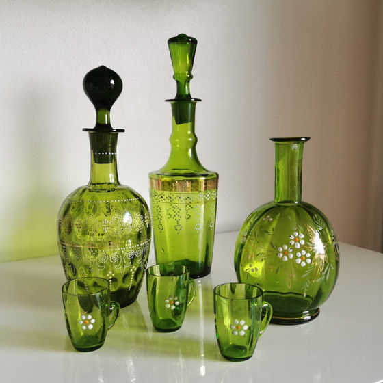 Spettacolare set di 3 bottiglie e 3 bicchieri antichi francesi, realizzati in finissimo cristallo. Dipinti a mano con smalto e vernice dorata. La lavorazione del vetro è realizzata a mano, come dimostrano le irregolarità e le pieghe. Oltre ai disegni, risaltano le forme del vetro: rotonde, ondulate, ecc. Vi consigliamo di guardare le foto più da vicino per apprezzare la bellezza di queste bottiglie. Il set è in buone condizioni, senza ammaccature o crepe, ma presenta una leggera usura della doratura, tipica del suo tempo. Misure: vedi foto. Tutti i pezzi venduti nel nostro negozio sono antichi o vintage, quindi potrebbero presentare segni di usura e del tempo. Si prega di ingrandire le foto per valutare le condizioni dell'articolo secondo i propri criteri. I nostri articoli sono unici e possono essere venduti nei negozi, quindi le vendite online sono soggette a disponibilità. 193*23 #licorera #botella #bote #cristal #garrafa #botellacristal #licoreraantigua #artnoveau #modernista #legras #antiguo #vintage #antiguedades #jarra #jarracristal #carafe #liqueur #vase #vaseverre #verre #antiquites #vintage #jarre #carafe #decanter #glass #old #antiques #jar #glassjar #bottiglia #licore #vetro #antico #anzianita #caraffa #barattolo #fiori #antigo #karaffe #hausbar #glas #alt #antiquitat #karaf #kruik #tinnen #antiek #keramiek #antieke #drankfles #likeurfles #antiek #antieke #antiek #antiquiteiten #kanns #flasch #ergoud #antike