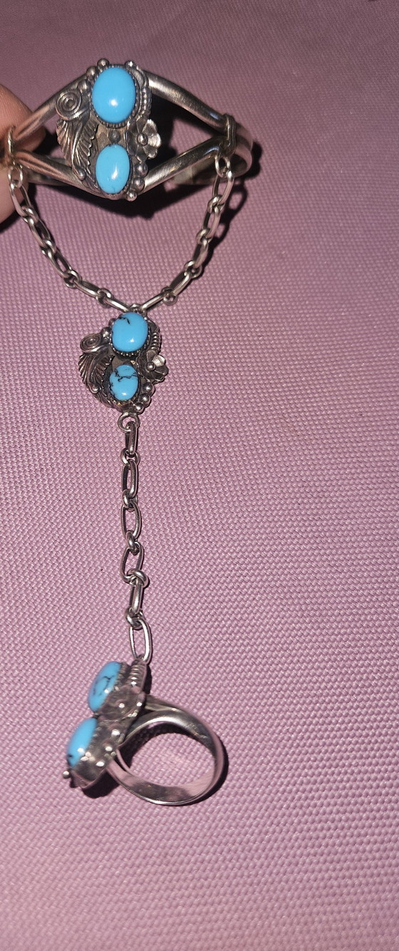 Scopri questo squisito bracciale Navajo, realizzato in autentico argento sterling 925 e impreziosito da vivaci pietre di turchese blu. Questo classico gioiello in stile Navajo affascina con la sua intricata lavorazione artigianale e i dettagli floreali che richiamano la bellezza della natura. Il bracciale è collegato a un anello abbinato tramite un'elegante catena, conferendogli un aspetto unico e raffinato. Perfetto per gli amanti dei gioielli nativi americani di alta qualità, questo set è un vero gioiello che cattura lo sguardo e un prezioso oggetto da collezione. Lasciati incantare dall'eleganza senza tempo e dal patrimonio culturale di questo pezzo e aggiungi un tocco boho ed etnico al tuo stile. Contattaci oggi stesso per acquistare questo gioiello speciale.