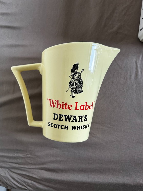 Brocca in ceramica per l'acqua del whisky scozzese White Label Dewar's. Brocca degli anni '60, ampiamente utilizzata in bar e caffè per servire acqua insieme al whisky. Altezza 17 cm, 10,5 x 14 pollici (diametro 10,5 cm incluso il beccuccio, 14 cm).