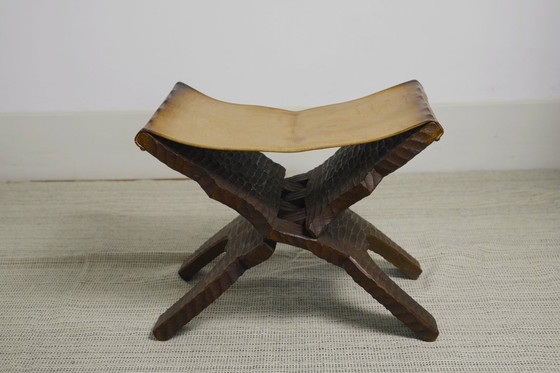 Brutalist Folding Stool Leather Sling Seat Hand Carved Wood X Frame 1950s Rustic Mid Century Ottoman
