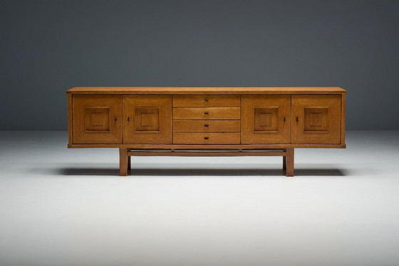 Questa sorprendente credenza brutalista in rovere belga, modello 187/9, incarna la raffinata maestria artigianale e l'eleganza geometrica del design dei mobili degli anni Sessanta. Realizzata in rovere massiccio e impiallacciato, presenta una facciata simmetrica con quattro cassetti centrali affiancati da due coppie di ante. Le ante sono ornate da intagli incassati a pannelli quadrati, che creano un aspetto architettonico distintivo, mentre i cassetti sono rifiniti con tiretti rettangolari neri minimalisti che contrastano splendidamente con le calde tonalità del rovere.