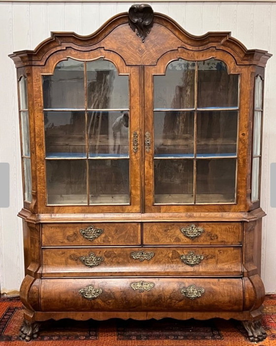 Magnifica credenza olandese! In buone condizioni considerando la sua età, credo fine XIX o inizio XX secolo. Il precedente proprietario ha dipinto i ripiani di blu. Uno di essi sembra più nuovo dell'altro. La serratura nella parte superiore funziona. Le serrature dei cassetti sono prive di chiavi. Alcune rare scheggiature nell'impiallacciatura. Altre foto su richiesta.