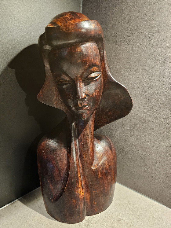 Descrizione: Splendida scultura modernista in legno raffigurante un busto femminile stilizzato con gli occhi chiusi. La scultura è intagliata a mano in legno massello (probabilmente mogano o noce) e presenta una patina marrone caldo e intenso.