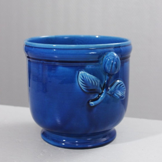 Cachepot vintage in ceramica con smalto blu craquelé, stile Chambost, anni '70