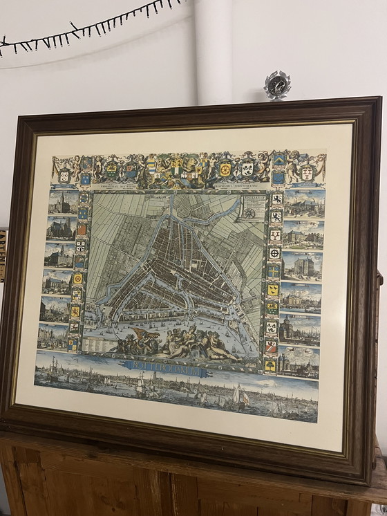 Caert de Vou, una mappa di Rotterdam del 1964, originariamente pubblicata dal Comune di Rotterdam nel 1975. È una riproduzione, una serigrafia o litografia, di circa 1 metro per 1 metro. In vendita, cornice inclusa. Apparteneva a mio padre, l'unico proprietario. Romeyn de Hooghe, maestro di calligrafia, la realizzò su richiesta dell'allora sindaco.