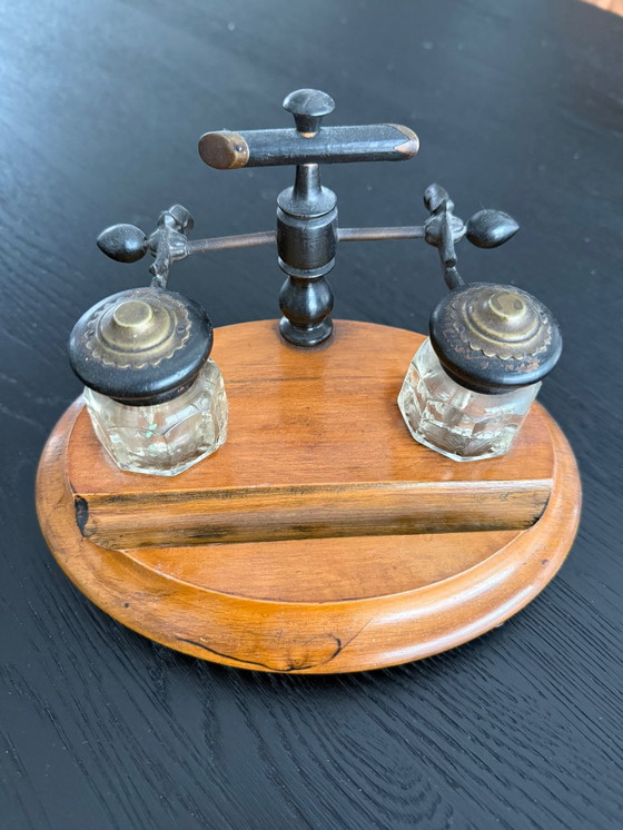 - Design classico con base in legno e calamai in vetro.