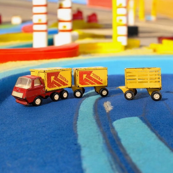 Camion per le consegne Tonka vintage in acciaio stampato degli anni '70 con rimorchio abbinato. Si tratta di un gruppo di tre pezzi, incluso un rimorchio agricolo aggiuntivo dello stesso periodo. Il rimorchio agricolo può anche essere trainato dal camion per le consegne. Le ruote di tutti e tre sono scorrevoli. Il vano di carico del camion per le consegne è incernierato, consentendone il ribaltamento.