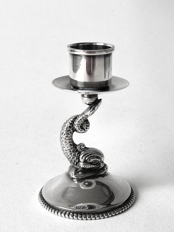 Candeliere in argento con bordo a forma di pesce e perla - Marcato