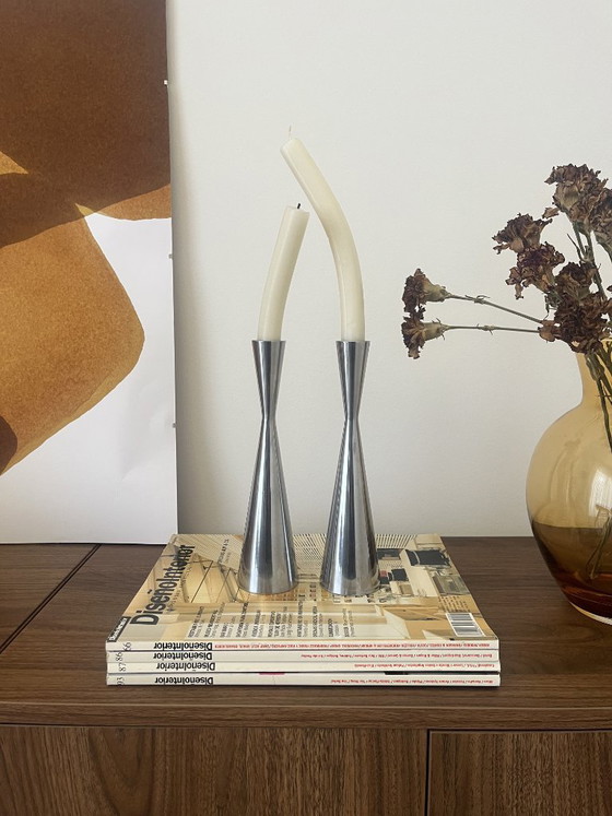 Coppia di candelabri disegnati da Erika Pekkari per IKEA negli anni '90. Realizzati in alluminio pressofuso, presentano un design scandinavo pulito e senza tempo. Conservano l'etichetta originale sulla base. Restaurati a mano, riportando l'alluminio al suo splendore naturale. Altezza 23 cm.
