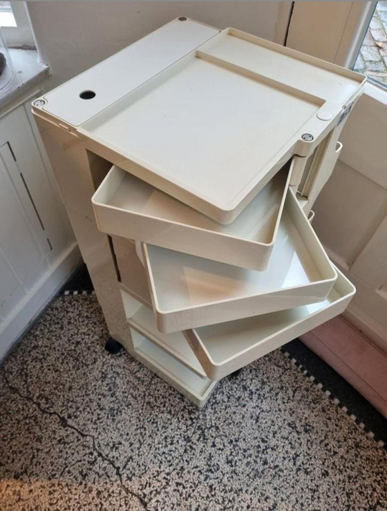 Carrello Boby vintage, disegnato da Joe Colombo negli anni '70. Il carrello è usato e originariamente era bianco, ma è sbiadito nel corso degli anni (più giallo nella realtà che nelle foto). Ha bisogno di essere pulito e curato, ma è un oggetto delizioso per collezionisti o intenditori di vintage. Un pezzo di design iconico! Altezza 94 cm.