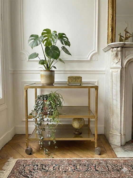 Scopri questo elegante carrello da portata vintage in vetro e ottone dorato, un pezzo senza tempo che unisce fascino retrò e funzionalità. In ottime condizioni, questo raffinato mobile si distingue per il suo design curato e i dettagli dorati che aggiungono un tocco di raffinatezza ai tuoi interni.