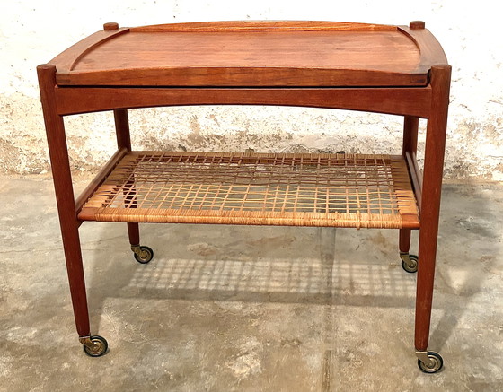 Questo squisito carrello da tè in legno di teak di Poul Hundevad è una testimonianza dell'artigianato e del design danese. Il piano rimovibile ne aumenta la versatilità, consentendogli di fungere sia da vassoio da portata che da elegante carrello bar. Le sue linee pulite e le calde tonalità del legno sono completate dal ripiano inferiore in canna intrecciata.