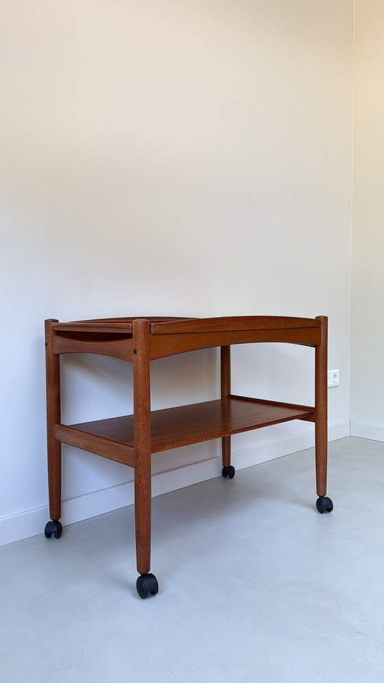 Carrello vintage danese degli anni '60, disegnato da Poul Hundevad per Bernstorffsminde Møbelfabrik. Dimensioni: 73 L x 43 P x 62 A cm. La struttura è in teak massello e presenta due ripiani impiallacciati in teak. Il ripiano superiore è rimovibile e può essere utilizzato come vassoio. Il carrello è in buone condizioni vintage, con minimi segni di usura coerenti con la sua età.