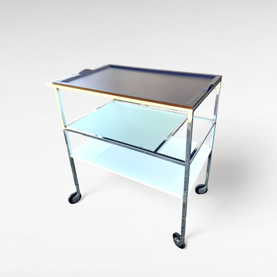 Carrello di servizio di design italiano degli anni '80. Designer e produttore sconosciuti. Presenta una struttura in metallo cromato con vassoio in legno, ripiano in vetro satinato, base in formica e ruote OGTM italiane. Dimensioni: A 78 cm, L 76 cm, P 44 cm. L'articolo è in buone condizioni. La cromatura è in ottime condizioni e le ruote scorrono senza problemi. Il piano in vetro è scheggiato (vedi foto).
