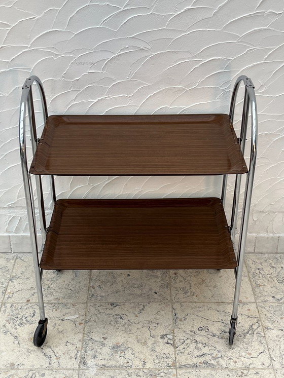 Carrello di servizio pieghevole vintage con due ripiani, caratterizzato da una struttura tubolare cromata e ripiani in laminato effetto legno, tipico del design europeo degli anni '60 e '70, probabilmente di produzione francese o tedesca.
