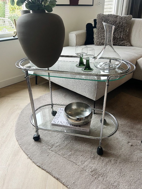 Un vero classico del design degli anni '70, il carrello di servizio Riki T52 di Gallotti & Radice. Questo elegante carrello di servizio combina un'elegante finitura cromata con vetro trasparente, aggiungendo un tocco lussuoso e leggero a qualsiasi interno.