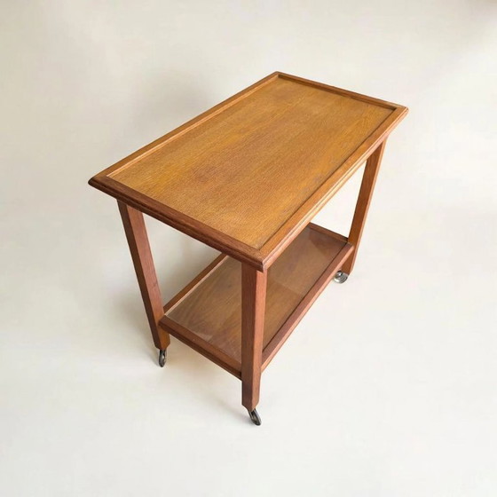 Carrello di servizio vintage in legno, tavolino laterale con ruote degli anni '60/'70 in stile scandinavo, solido carrel