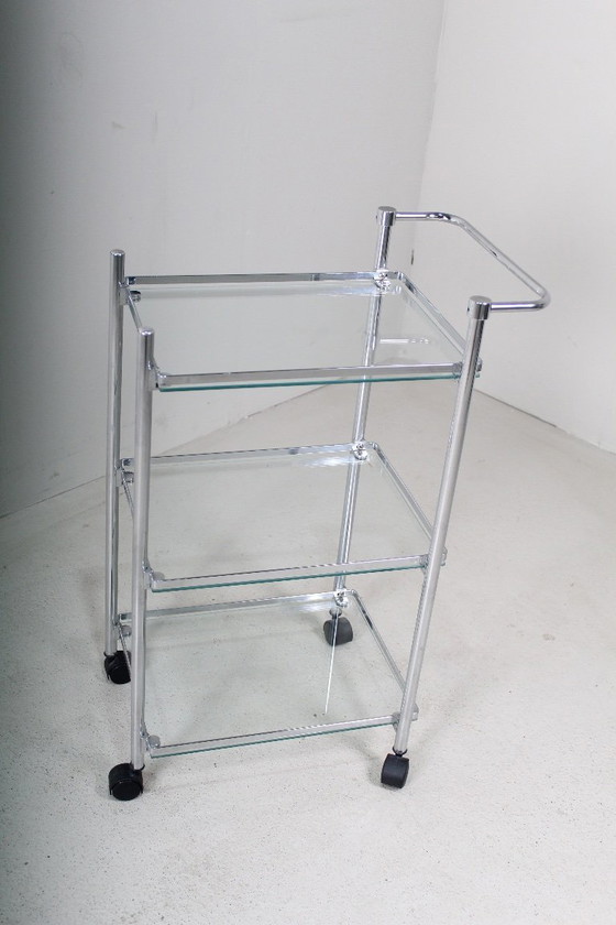 Questo splendido carrello da portata o tavolino vintage è realizzato in metallo cromato e vetro. Risale agli anni '80, ma la sua finitura cromata argentata lo rende perfetto per un arredamento moderno. È dotato di tre ripiani in vetro, perfetti per esporre splendidi bicchieri e altri oggetti da esposizione. Le rotelle sono in plastica.