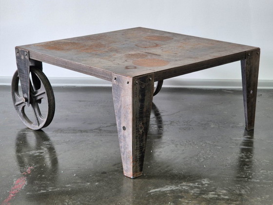 Carrello industriale brutalista del tavolino da caffè in acciaio