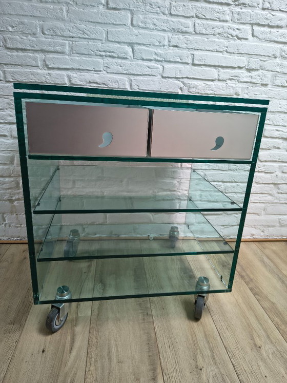 Questo carrello Grattacielo, disegnato da Marco Gaudenzi, è tuttora prodotto da Tonelli design. I due cassetti sono stati aggiunti successivamente. Piccolo danno alla piastra girevole in vetro, vedi foto. Il carrello è speciale per la piastra girevole. Negli ultimi anni non è più presente nei cataloghi Tonelli.