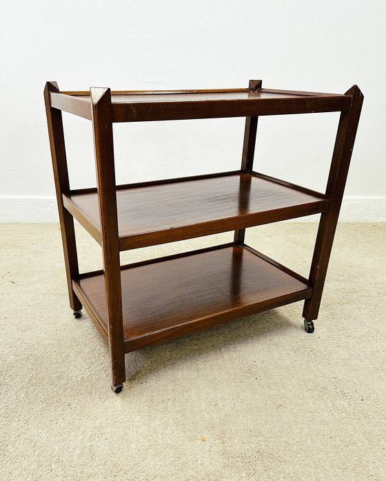 Carrello portavivande e porta tè di Richard Hornby in teak afromosia massello, con tre ripiani fissi su ruote. Progettato negli anni '60.