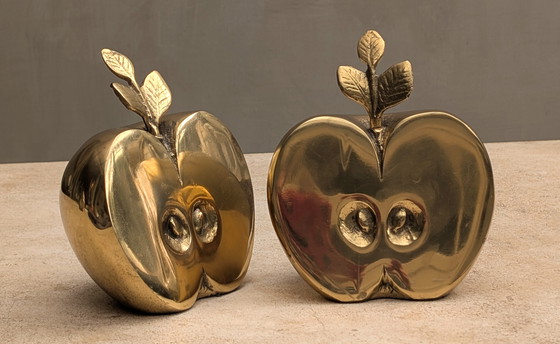 Ai: Bellissimi fermacarte o fermalibri degli anni '50 a forma di mela, realizzati in ottone. Questi oggetti decorativi emanano uno stile Hollywood Regency e sono perfetti per aggiungere un tocco di fascino vintage ai vostri interni. Il design è sia funzionale che estetico, ideale per sostenere i libri o come pezzo decorativo accattivante.