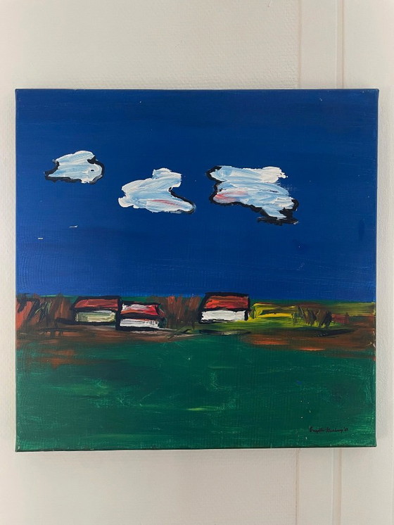 Titolo: "Casa's a la mar" del 2003. Dipinto su tela. 50 x 50 x 1 (blu scuro) su sfondo (lati della tela dipinti lungo il bordo). Durante questo periodo, ho creato diversi paesaggi urbani e paesaggi con i colori di Cobra.