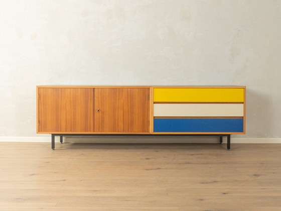 Splendida credenza degli anni '60. Corpo impiallacciato in noce con due ante, un ripiano, tre cassetti rivestiti in formica nei colori giallo, bianco sporco e blu, e nuovi piedini quadrati in acciaio nero. Il piano superiore era rivestito in formica nera.