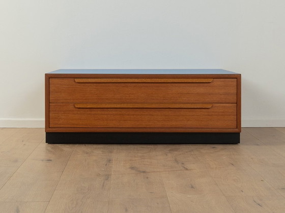 Cassettiera classica degli anni '60. Il corpo è realizzato in impiallacciatura di teak con due cassetti e una base nera a contrasto. Il piano è rivestito in formica blu. Le caratteristiche di qualità includono un'ottima lavorazione, materiali di alta qualità, un corpo con bordi in legno massiccio, cassetti in legno massiccio ed è stata prodotta in Germania dal produttore WK Möbel (marchio sul corpo).