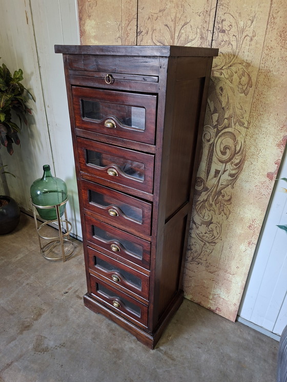 - Realizzata in legno di alta qualità con pannelli in vetro, questa cassettiera emana un fascino senza tempo.