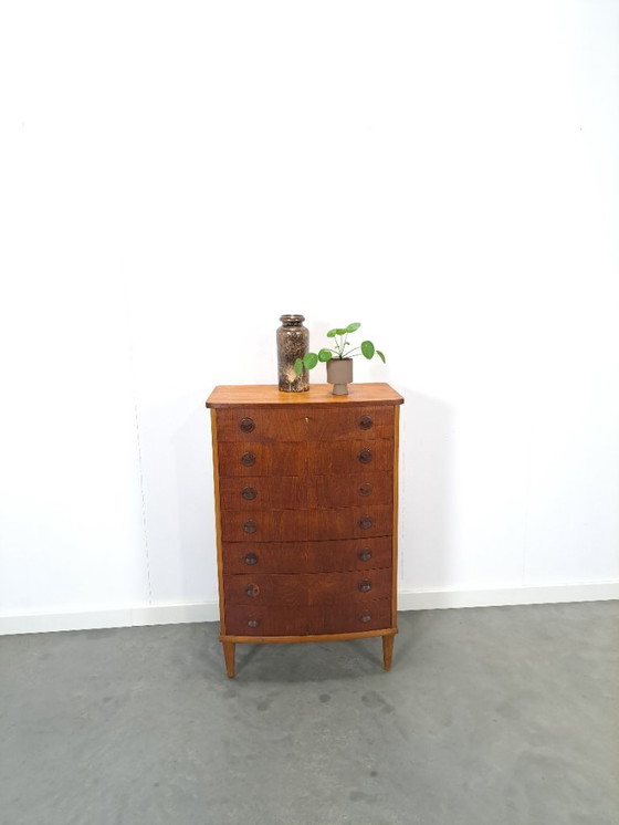 Questa cassettiera vintage proviene dalla Danimarca e presenta un frontale splendidamente curvo e sette ampi cassetti con maniglie rotonde. Questa cassettiera danese è ideale per il soggiorno, l'ingresso o la camera da letto grazie al suo ampio spazio contenitivo e al design senza tempo.