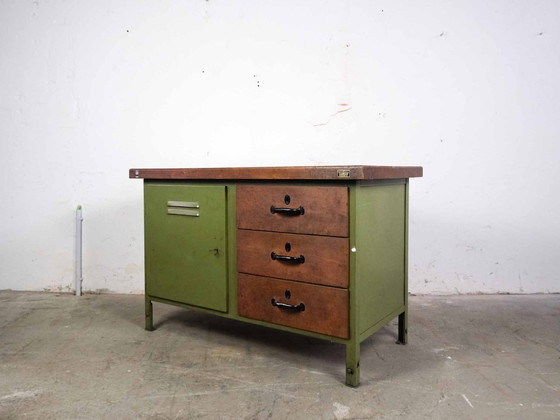 Questa cassettiera vintage da banco da lavoro è un ottimo esempio di design industriale e funzionalità. Con la sua robusta struttura in legno e metallo, dona un tocco di storia e carattere a qualsiasi ambiente. La combinazione di una struttura in metallo verde e cassetti in legno marrone le conferisce un autentico look vintage, pratico ed esteticamente gradevole.