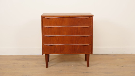Cassettiera vintage danese, caratterizzata da un design elegante e raffinato. Le maniglie di stile, il caldo colore del teak e le splendide venature del legno conferiscono a questo mobile un tipico look scandinavo. Grazie alle sue dimensioni, questa cassettiera si adatta a diversi ambienti.