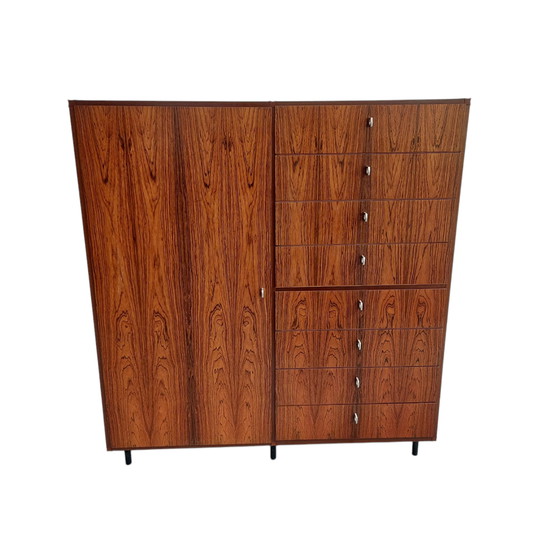 Questa cassettiera vintage in palissandro è una splendida soluzione di archiviazione dal look classico. Il design del mobile combina funzionalità ed estetica, con più cassetti e una sezione armadio per opzioni di archiviazione versatili. Le calde tonalità marroni del palissandro/venere conferiscono al mobile un fascino senza tempo. Ideale per gli amanti dei mobili vintage alla ricerca di un pezzo unico per i loro interni. Il mobile è in ottime condizioni vintage con alcuni (leggeri) segni d'uso. Dimensioni: 123 x 34,5 x 133 cm (l x p x h).