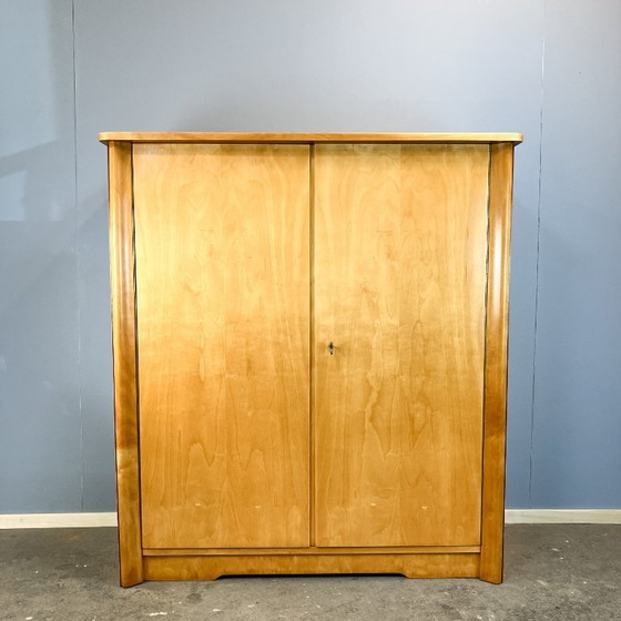 Cassettiera di metà secolo, betulla fiammata, anni '50, restaurata