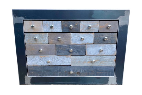 Scopri questa elegante cassettiera a 15 cassetti di Loftboutik, un capolavoro del design industriale degli anni 2010. La sua struttura in metallo nero, abbinata a cassetti in legno in diverse tonalità di grigio e marrone, offre un contrasto sorprendente che valorizzerà i tuoi interni.
