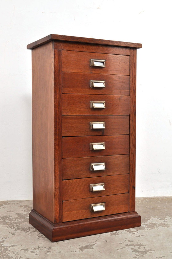 Cassettiera in rovere con 8 cassetti (tutti adatti al formato A4) degli anni '30. Maniglie molto belle. Sul lato di ogni maniglia è presente una fessura per inserire un'etichetta.
