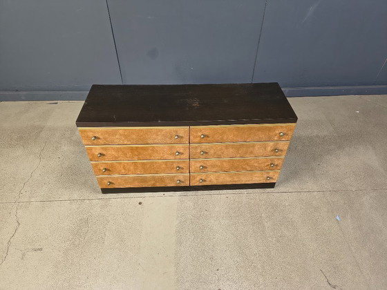 Cassettiera vintage con cassetti in velluto e ottone.