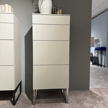 Cassettiera Neo con 4 cassetti Apertura a pressione Colore: Laccato grigio seta Base in metallo B cromato lucido Dimensioni (a x l x p): 130x53x45 cm In base al ritiro in loco, costi di consegna da concordare.