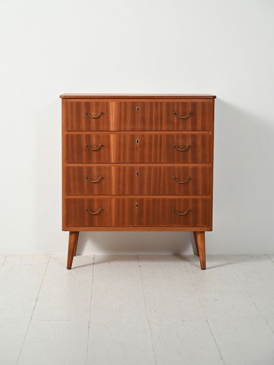 Cassettiera nordica in mogano dalle linee pulite, gambe affusolate e classiche maniglie in ottone.