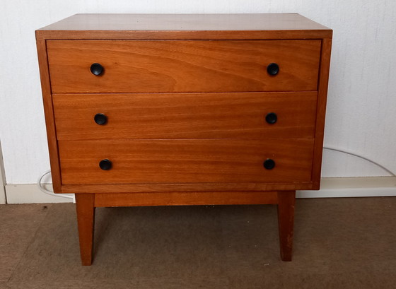 Questa cassettiera vintage è un'affascinante aggiunta a qualsiasi interno. Realizzata in legno, presenta un caldo colore marrone con pomelli neri per un sottile contrasto. Il mobile è dotato di tre cassetti spaziosi, ideali per riporre vari oggetti. Lo stile vintage gli conferisce un aspetto senza tempo, perfetto per gli amanti dei mobili retrò.